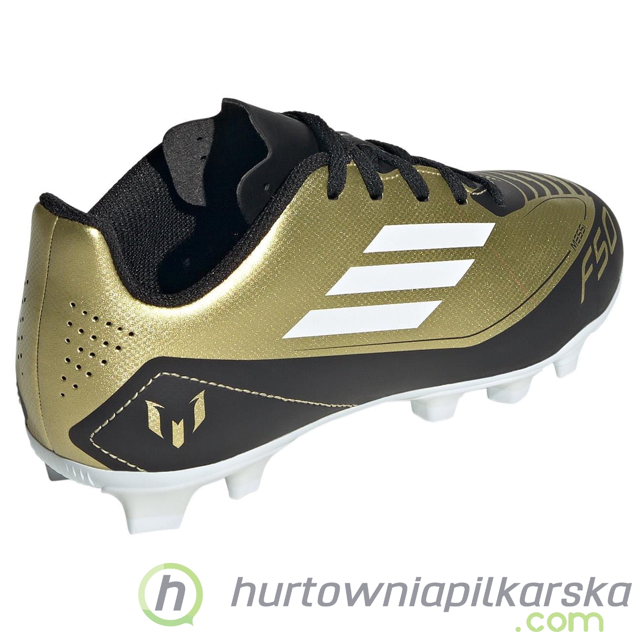 Buty piłkarskie dla dzieci adidas F50 Club Messi FXG z kolekcji Messi Triunfo Dorado. Estetyka inspirowana legendarnym stylem Messiego w połączeniu z technologią pozwalajacą osiągać niezrównaną prędkość i dynamikę na boisku. Lekka cholewka i perforowany język. Dzięki uniwersalnej podeszwie nadają się do gry na każdej nawierzchni.